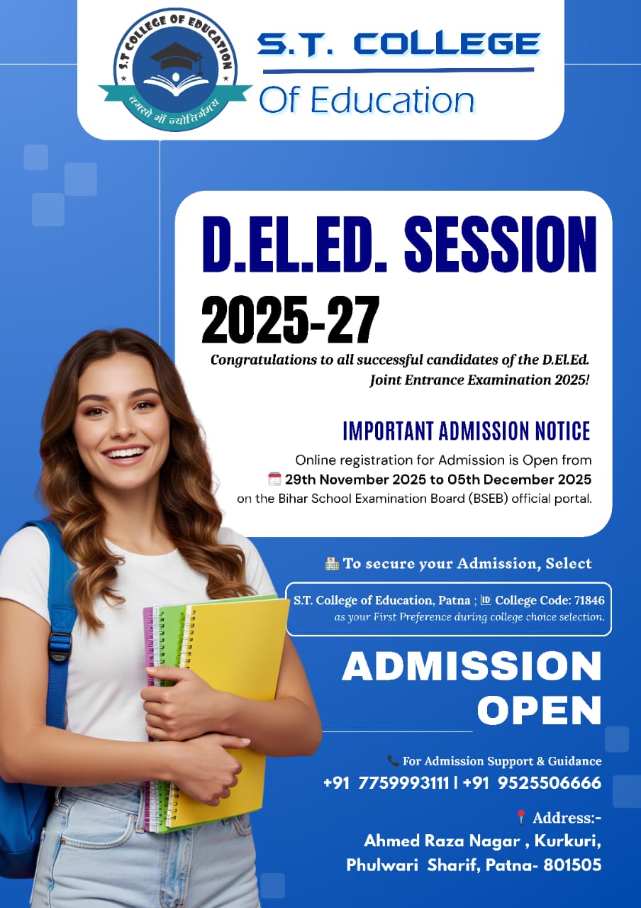 Any Progressive nation always demands a high level of knowledge-based society. To achieve it, enhanced, educated, trained, skilled and research prone professionals are constantly needed. S.T College of Education, Patna, is registered under the MARYAM WELFARE & EDUCATIONAL TRUST. Considering this some visionaries of educational arena engaged in various activities of social development have taken the oath to set up and flourish a Teacher Training College in a corner of Bihar, Patna to extend the scope of teachers training to the unreached.